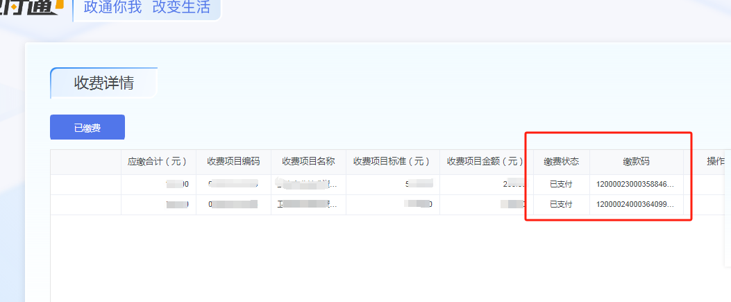 2.進入后,紅框中繳款碼碼攔為此次考試繳費產(chǎn)生對應的繳款碼(此處注意選擇繳費狀態(tài)為已支付狀態(tài)的繳款碼)