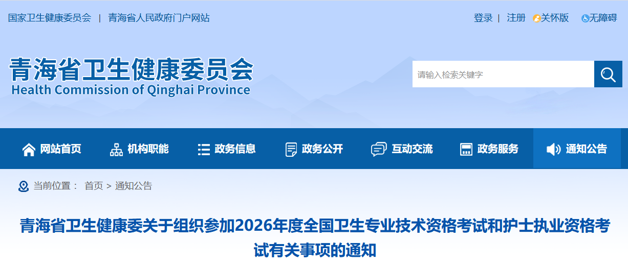 青海省衛(wèi)生健康委發(fā)布《青海省衛(wèi)生健康委關(guān)于組織參加2026年度全國(guó)衛(wèi)生專業(yè)技術(shù)資格考試和護(hù)士執(zhí)業(yè)資格考試有關(guān)事項(xiàng)的通知 》,醫(yī)學(xué)教育網(wǎng)小編整理內(nèi)容如下: