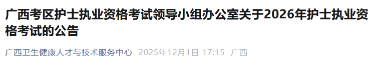 根據(jù)全國(guó)護(hù)士執(zhí)業(yè)資格考試委員會(huì)辦公室、國(guó)家衛(wèi)生健康委人才交流服務(wù)中心工作部署,為做好2026年護(hù)士執(zhí)業(yè)資格考試廣西考區(qū)考試工作,現(xiàn)將有關(guān)事項(xiàng)公告如下: