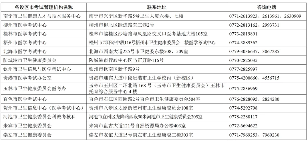 廣西考區(qū)各設(shè)區(qū)市考試管理機(jī)構(gòu)聯(lián)系地址及咨詢電話見(jiàn)附件2,各考生前往現(xiàn)場(chǎng)確認(rèn)前請(qǐng)務(wù)必與所在設(shè)區(qū)市考試管理機(jī)構(gòu)聯(lián)系。