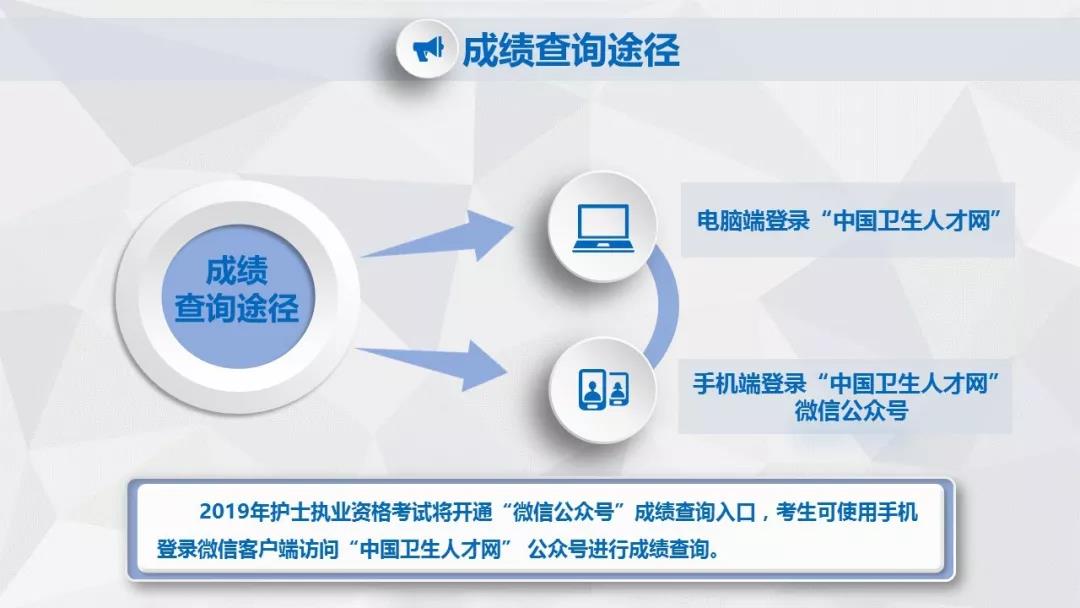 2019年護(hù)士資格考試成績可以通過中國衛(wèi)生人才網(wǎng)官網(wǎng)或者中國衛(wèi)生人才網(wǎng)微信公眾號2種途徑查詢!