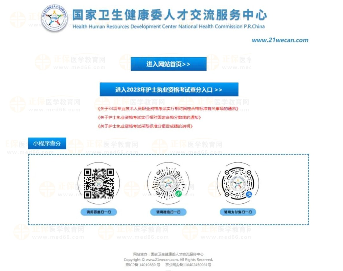1.國(guó)家衛(wèi)生健康委人才交流服務(wù)中心官方網(wǎng)站和小程序是查詢2023年護(hù)士執(zhí)業(yè)資格考試成績(jī)的正式途徑。