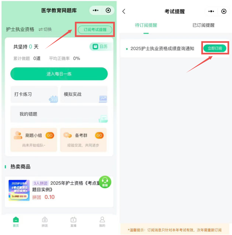 2025年護士資格考試已結束,考試成績預計于考后兩個月公布!為了幫助大家及時查詢到考試成績,網校推出微信訂閱通知,按照以下步驟即可輕松訂閱!不用自己擔心,成績公布后網校及時發(fā)送消息通知!