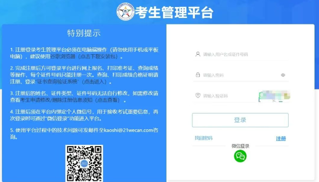 2.使用報(bào)名階段時(shí)注冊(cè)的用戶名、密碼,登錄考生管理平臺(tái);也可通過(guò)“微信登錄”功能,使用綁定的微信號(hào)掃碼登錄考生管理平臺(tái)。