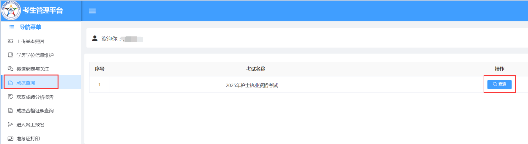 3.先點(diǎn)擊左側(cè)導(dǎo)航菜單中的“成績(jī)查詢”功能,再點(diǎn)擊2025年護(hù)士執(zhí)業(yè)資格考試項(xiàng)目右側(cè)的“查詢”按鈕即可顯示查詢結(jié)果。