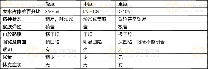 【解答】不同程度的脫水的臨床表現(xiàn)如下,可通過(guò)皮膚彈性、尿量和精神狀態(tài)等進(jìn)行區(qū)分。