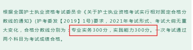 中國衛(wèi)生人才網(wǎng)官方通知:根據(jù)全國護(hù)士執(zhí)業(yè)資格考試委員會(huì)《關(guān)于護(hù)士執(zhí)業(yè)資格考試實(shí)行相對(duì)固定合格分?jǐn)?shù)線的通知》(護(hù)考委發(fā)【2019】1號(hào))要求,2021年考試形式、考試大綱無重大變化,合格分?jǐn)?shù)線分別為:專業(yè)實(shí)務(wù)300分,實(shí)踐能力300分。一次考試通過兩個(gè)科目為考試成績合格。