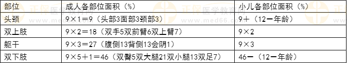 中國(guó)新九分法適用于較大面積燒傷的評(píng)估。該法將體表面積分為11個(gè)9%,另加會(huì)陰區(qū)的1%,構(gòu)成100%的體表面積。12歲以下小兒頭部面積較大,雙下肢面積相對(duì)較小,測(cè)算方法應(yīng)結(jié)合年齡進(jìn)行計(jì)算(見下表)。