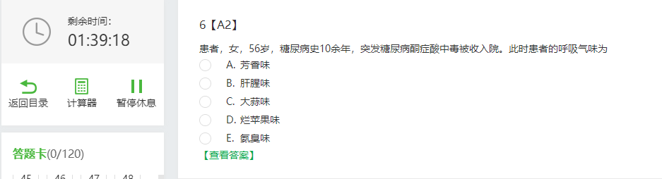 考點回顧:患者,女,56歲,糖尿病史10余年,突發(fā)糖尿病酮癥酸中毒被收入院。此時患者的呼吸氣味為?