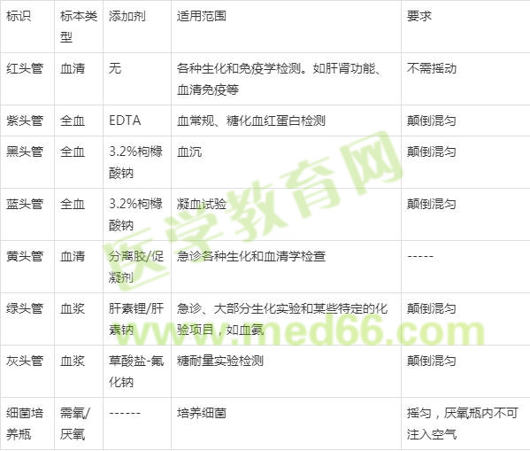 1.全血標本測定紅細胞沉降率、血常規(guī)、血糖、尿素氮、血氨等,使用抗凝試管,采集后輕搖試管。