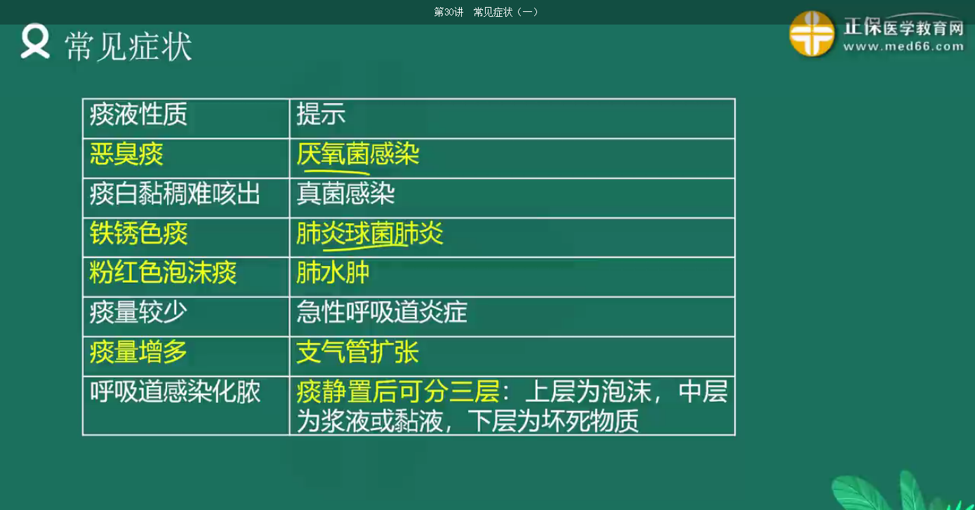 惡臭痰提示有厭氧菌感染;痰白黏稠難以咳出提示有真菌感染;鐵銹色痰為典型肺炎球菌肺炎的特征;粉紅色泡沫痰是肺水腫的特征。
