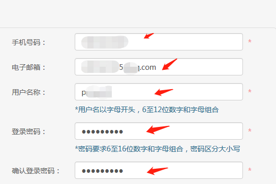 四、填寫自己的手機(jī)號(hào)、電子郵箱、用戶名和密碼。用戶名自行設(shè)置,以字母開頭,6-12位即可。
