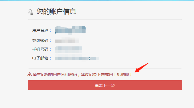 五、這樣就基本注冊(cè)好了,把賬號(hào)和密碼記錄下來,建議手機(jī)拍照保存。