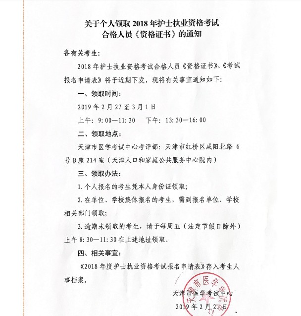 天津2018年護士資格考試證書領(lǐng)取時間已經(jīng)公布,為了幫助大家了解,醫(yī)學(xué)教育網(wǎng)為大家搜集整理如下: