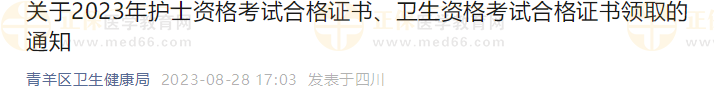 成都市青羊區(qū)關于2023年護士資格考試合格證書領取的通知