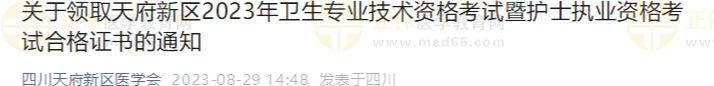 四川天府新區(qū)醫(yī)學(xué)會(huì)發(fā)布關(guān)于領(lǐng)取天府新區(qū)2023年衛(wèi)生專業(yè)技術(shù)資格考試暨護(hù)士執(zhí)業(yè)資格考試合格證書的通知,醫(yī)學(xué)教育網(wǎng)整理具體內(nèi)容如下: