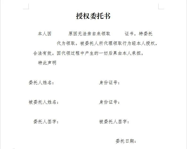 2.他人代領(lǐng):考生出具委托書及身份證復(fù)印件交被委托人,由被委托人攜帶本人身份證原件領(lǐng)取?;蛘叽I(lǐng)人持雙方身份證原件領(lǐng)取。(委托書格式見下方)