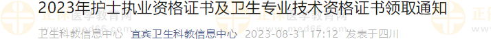 宜賓考點(diǎn)2023年護(hù)士執(zhí)業(yè)資格證書及衛(wèi)生專業(yè)技術(shù)資格證書開始發(fā)放,證書發(fā)放相關(guān)事宜通知如下: