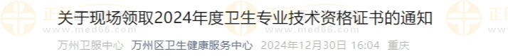 重慶萬州區(qū)關(guān)于現(xiàn)場領(lǐng)取2024年度衛(wèi)生專業(yè)技術(shù)資格證書的通知公布啦!醫(yī)學(xué)教育網(wǎng)整理具體內(nèi)容如下: