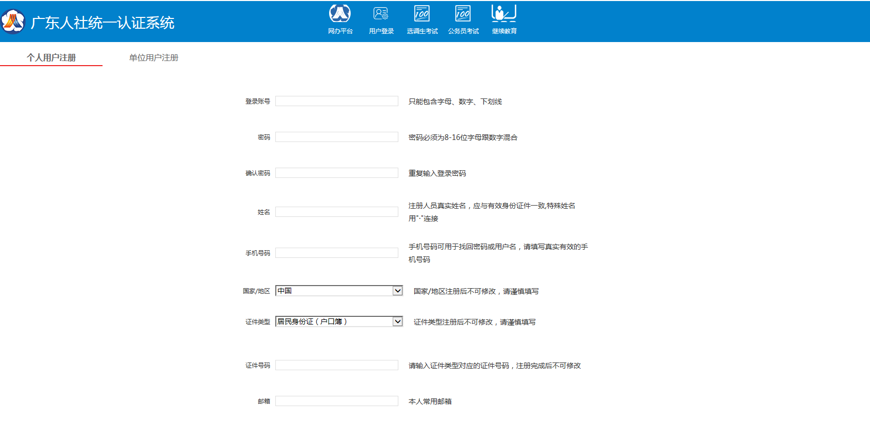 已在廣東省人力資源和社會(huì)保障廳網(wǎng)上服務(wù)平臺(tái)注冊(cè)的用戶(hù),請(qǐng)使用原用戶(hù)名、密碼登錄電子證書(shū)系統(tǒng),無(wú)需再次注冊(cè);未在該平臺(tái)注冊(cè)過(guò)的用戶(hù),在系統(tǒng)入口請(qǐng)點(diǎn)擊注冊(cè)按鈕進(jìn)入個(gè)人用戶(hù)注冊(cè)界面,如實(shí)填寫(xiě)姓名、證件類(lèi)型、證件號(hào)碼、手機(jī)號(hào)碼和郵箱等個(gè)人信息后即完成注冊(cè)。