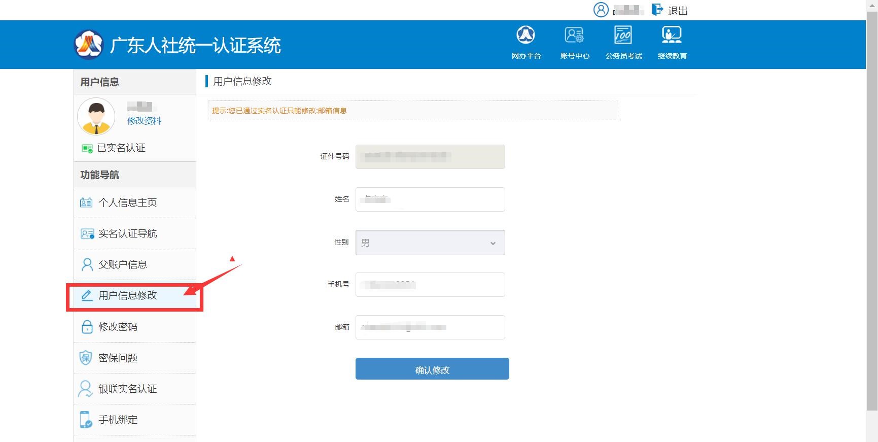 在賬號(hào)中心界面,點(diǎn)擊用戶信息修改按鈕可以對(duì)個(gè)人注冊(cè)信息進(jìn)行修改。注:個(gè)人證件號(hào)碼不可修改;姓名在個(gè)人實(shí)名認(rèn)證后不可修改。