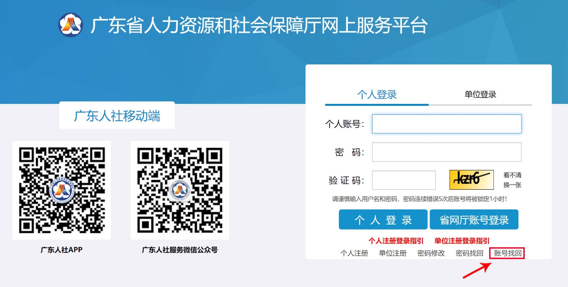 在廣東省人力資源和社會(huì)保障廳網(wǎng)上服務(wù)平臺(tái)登錄界面(網(wǎng)址:https://ggfw.gdhrss.gov.cn/ssologin/)點(diǎn)擊賬號(hào)找回按鈕,進(jìn)入個(gè)人賬號(hào)找回導(dǎo)航。