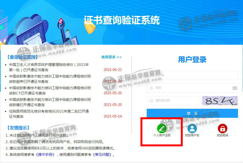 所有考生在使用國家衛(wèi)生健康委證書查詢驗證系統(tǒng)的時候必須先行注冊!證書查詢驗證系統(tǒng)是獨立的系統(tǒng),成績查詢或考試報名時使用的用戶名/密碼無法在本系統(tǒng)直接使用,需在本系統(tǒng)登錄頁面點擊“個人用戶注冊”。