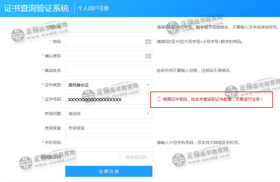 考生可以快捷驗證自己的信息是否錄入系統(tǒng),在“個人用戶注冊”界面只輸入證件號碼,【醫(yī)學(xué)教育網(wǎng)原創(chuàng)!轉(zhuǎn)載請注明出處!】當(dāng)驗證后出現(xiàn)紅字提示:“根據(jù)證件號碼、姓名未查詢到證書數(shù)據(jù),無需進行注冊”就說明考生信息還沒有錄入系統(tǒng)中,考生暫時無法進行注冊及下一步操作。【醫(yī)學(xué)教育網(wǎng)原創(chuàng)!轉(zhuǎn)載請注明出處!】如果輸入證件號碼后提示綠色?,則說明考生信息已經(jīng)錄入,考生可以正常注冊然后進行下一步。