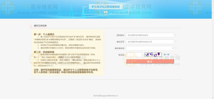 • 1、輸入您在護(hù)士電子化注冊系統(tǒng)中的“姓名”和“身份證號,“請求修改項(xiàng)”選擇“申請修改密碼”或“申請取消綁定手機(jī)號”,正確錄入“驗(yàn)證碼”后點(diǎn)擊“確定”,系統(tǒng)將自動完成電子化注冊信息驗(yàn)證;