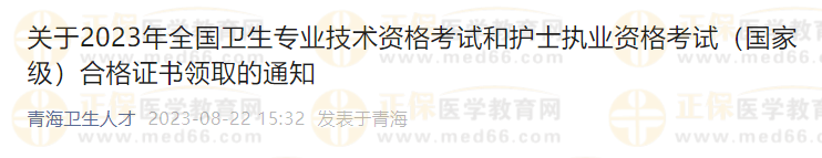 青海省2023年護士資格考試合格證書領(lǐng)取的通知