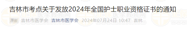 吉林市發(fā)布通知,2024年護(hù)士資格考試證書將于7月末發(fā)放!近期全國各地都會(huì)開始陸續(xù)公布證書發(fā)放通知,同學(xué)們可以持續(xù)關(guān)注醫(yī)學(xué)教育網(wǎng)動(dòng)態(tài)~