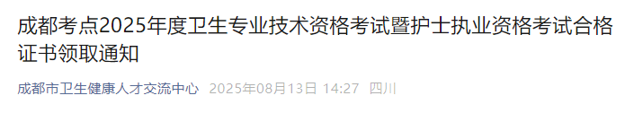 四川成都2025年度護(hù)士資格考試證書領(lǐng)取通知