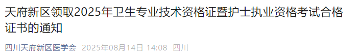 天府新區(qū)2025年衛(wèi)生專業(yè)技術(shù)資格證(初、中級)暨2025年護士執(zhí)業(yè)資格考試合格證書從2025年8月14日起開始領(lǐng)取,相關(guān)事宜如下: