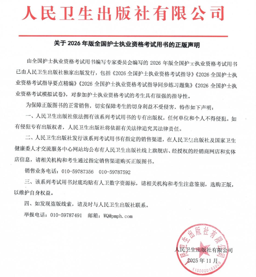 近期,國(guó)家衛(wèi)生健康委人才交流中心發(fā)布《關(guān)于2026年版全國(guó)護(hù)士執(zhí)業(yè)資格考試用書(shū)的正版聲明》,其中提到須在指定渠道購(gòu)買(mǎi)正版書(shū)籍。