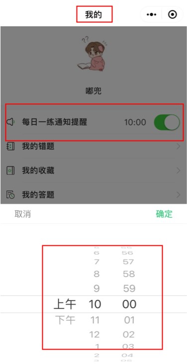 想要每天堅(jiān)持打卡,但是一忙起來(lái)總忘?想要督促自己每日必須完成打卡內(nèi)容?點(diǎn)擊“我的”,打開(kāi)“每日一練通知提醒”就可以解決啦!考生可以根據(jù)自己的工作休息時(shí)間自行設(shè)置打卡提醒時(shí)間。