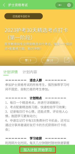 第三步:請選擇“您的備考計劃”,如“2023護考30天精選考點打卡(第一階段)”,點擊下方“加入計劃開始學(xué)習(xí)”