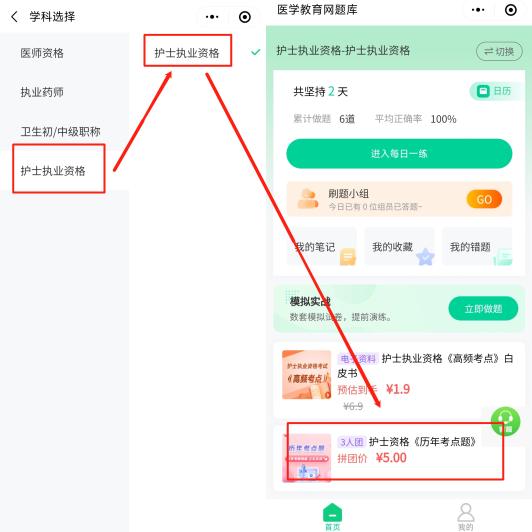 2、點(diǎn)擊“切換”-“護(hù)士執(zhí)業(yè)資格”,選擇報(bào)考類別,進(jìn)入類別頁(yè)面下滑到底部選擇“歷年考點(diǎn)題”,3人團(tuán),到手價(jià)僅需5元!