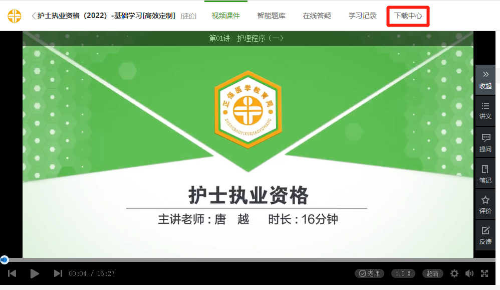 (2)進(jìn)入聽課頁面,點(diǎn)擊上方“下載中心”