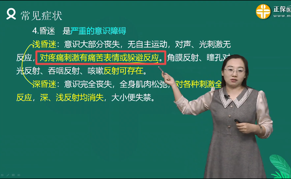 (1)淺昏迷:意識大部分喪失,無自主運動,對聲、光刺激無反應,對疼痛刺激有痛苦表情或躲避反應。角膜反射、瞳孔對光反射、吞咽反射、咳嗽反射可存在。