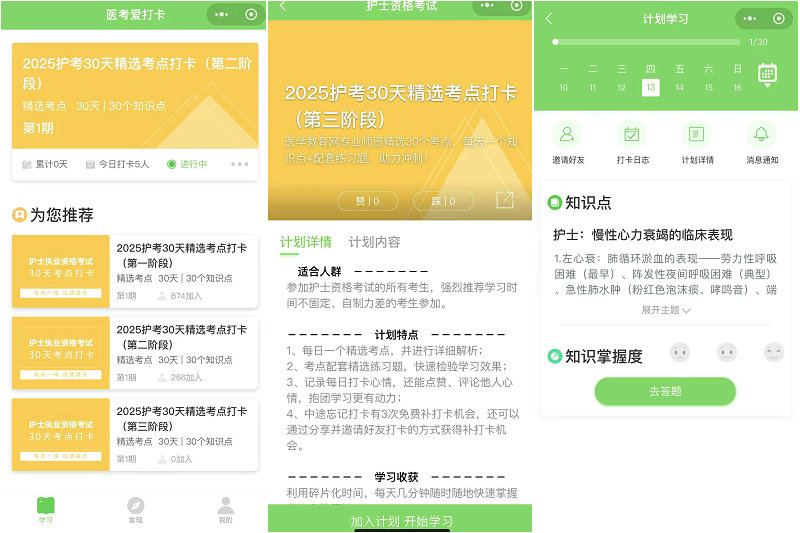 第三步:選擇打卡計(jì)劃,如“2025護(hù)考30天精選考點(diǎn)打卡(第三階段)”,點(diǎn)擊下方“加入計(jì)劃開(kāi)始學(xué)習(xí)”,進(jìn)入學(xué)習(xí)知識(shí)點(diǎn)并答題。