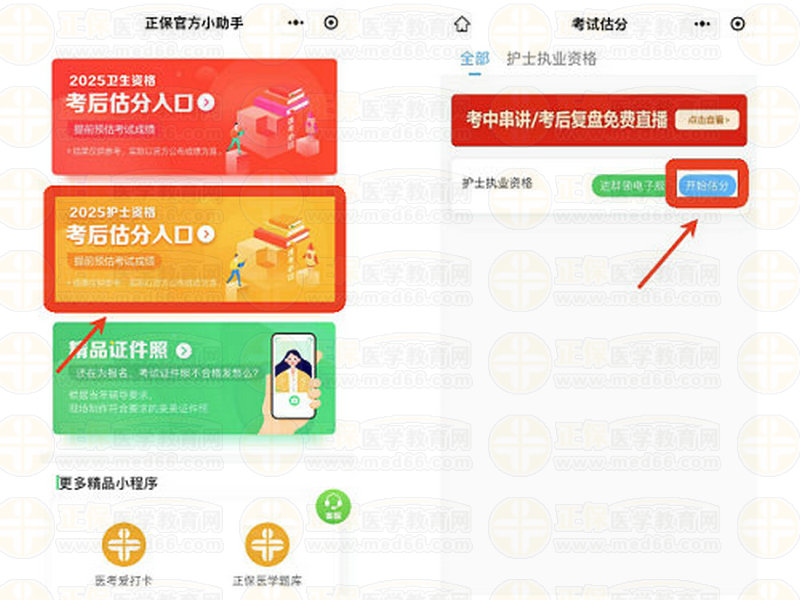 進入“正保官方小助手”小程序后,點擊進入“2025護士資格考后估分入口”——選擇考試類別——選擇考試科目——點擊“開始估分”。根據(jù)自己的實際考試情況,選擇“我答對了”或“我答錯了”,如記不清楚可以選擇“記不清了/未作答”。