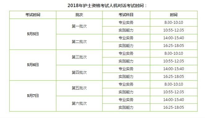 根據(jù)全國(guó)護(hù)士執(zhí)業(yè)資格委員會(huì)發(fā)布的公告,2018年護(hù)士考試全面實(shí)施人機(jī)考試,時(shí)間定于5月5-7日舉行,每半天為一個(gè)輪次,分為6輪依次進(jìn)行??忌鷮㈦S機(jī)分配至其中一個(gè)輪次,參加專(zhuān)業(yè)實(shí)務(wù)和實(shí)踐能力兩個(gè)科目的考試。具體時(shí)間如下: