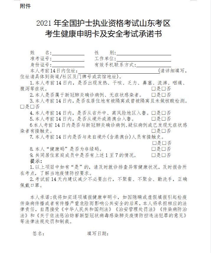為確保我市2021年護(hù)士執(zhí)業(yè)資格考試安全、順利實施,保障廣大考生和工作人員身體健康,根據(jù)國家及我省疫情防控的有關(guān)規(guī)定,按照山東考區(qū)辦公室《關(guān)于印發(fā)<醫(yī)師資格考試、護(hù)士執(zhí)業(yè)資格考試山東考區(qū)疫情防控工作方案>的通知》要求,考生須如實報告?zhèn)€人健康狀況,自覺接受疫情防控管理。