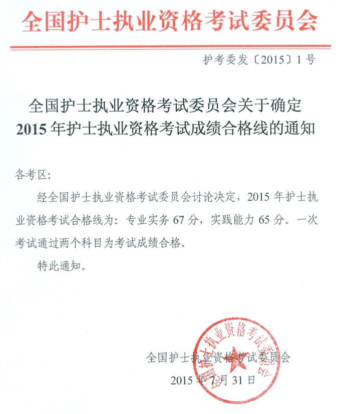 1.全國護(hù)士執(zhí)業(yè)資格考試委員會關(guān)于確定2015年護(hù)士執(zhí)業(yè)資格考試成績合格線的通知
