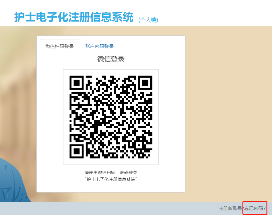 ①打開護士電子化注冊個人端登錄頁面,選擇“忘記密碼”。