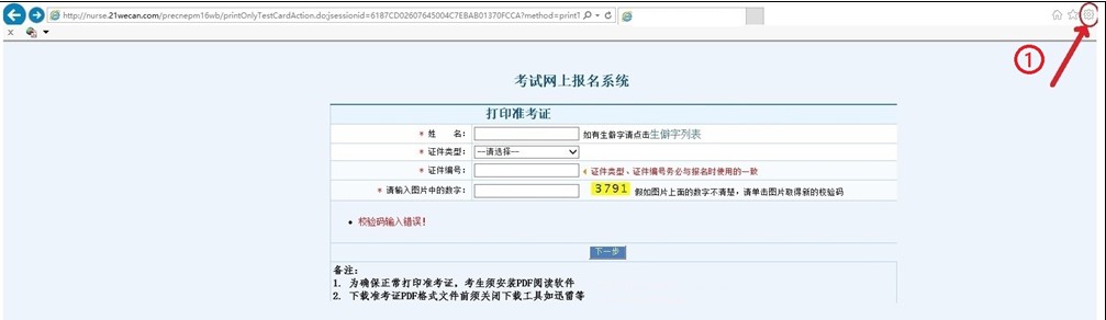 1.進入打印準考證頁面后,選擇IE瀏覽器菜單中的“工具”菜單項,或者點擊如下圖所示的齒輪圖標;