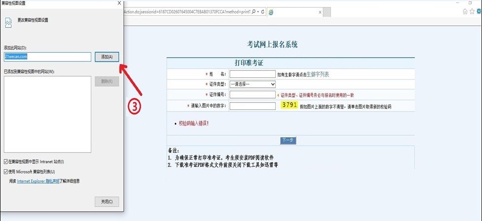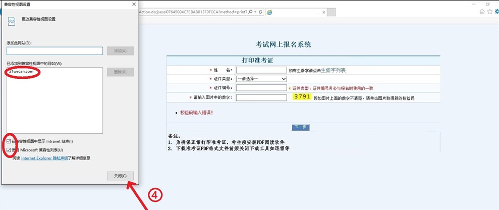4.確認“21wecan.com”出現(xiàn)在“已添加到兼容性視圖中的網(wǎng)站”下的方框中,同時確認如下圖的兩個勾選項,點擊“關閉”即可進行打印準考證操作。