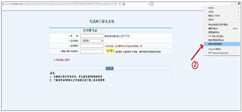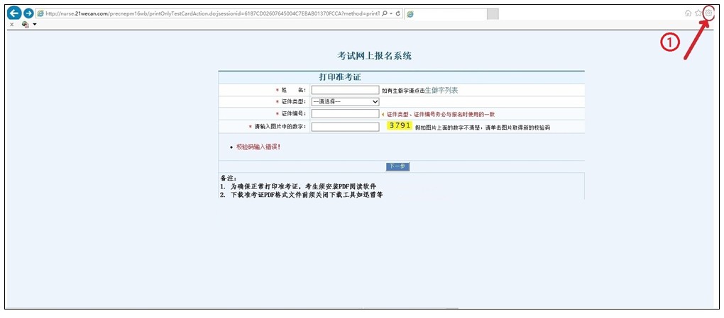 1.進(jìn)入打印準(zhǔn)考證頁(yè)面后,選擇IE瀏覽器菜單中的“工具”菜單項(xiàng),或者點(diǎn)擊如下圖所示的齒輪圖標(biāo)。