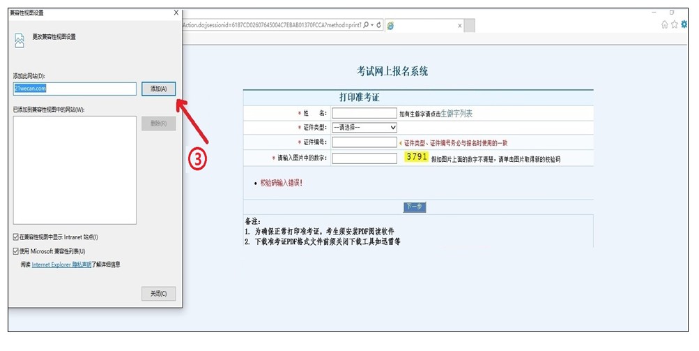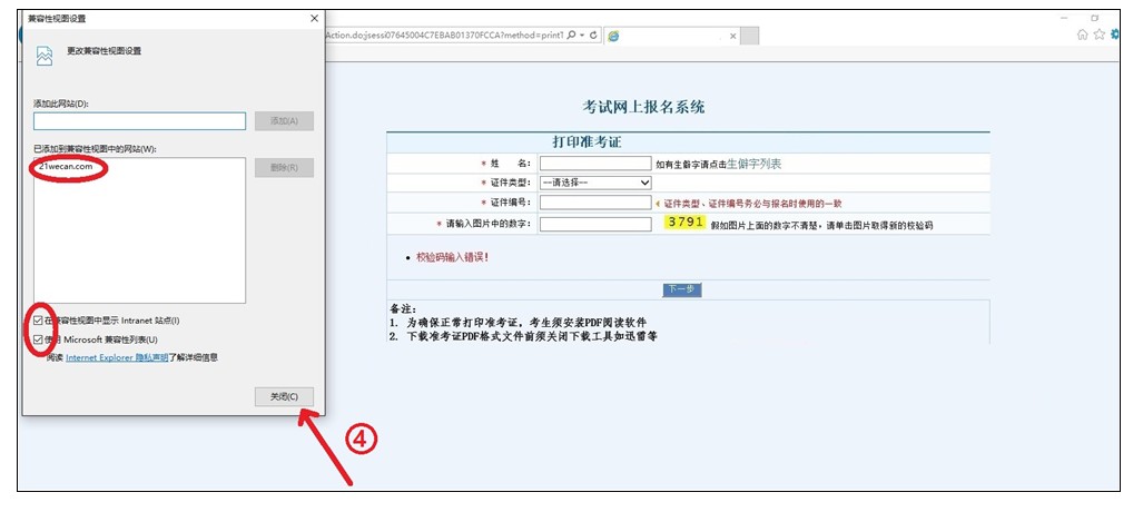 4.確認(rèn)“21wecan.com”出現(xiàn)在“已添加到兼容性視圖中的網(wǎng)站”下的方框中,同時(shí)確認(rèn)如下圖的兩個(gè)勾選項(xiàng),點(diǎn)擊“關(guān)閉”即可進(jìn)行打印準(zhǔn)考證操作。