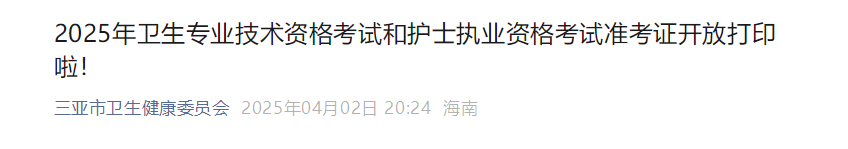 【海南三亞】2025年衛(wèi)生專業(yè)技術(shù)資格考試和護(hù)士執(zhí)業(yè)資格考試準(zhǔn)考證開放打印啦!